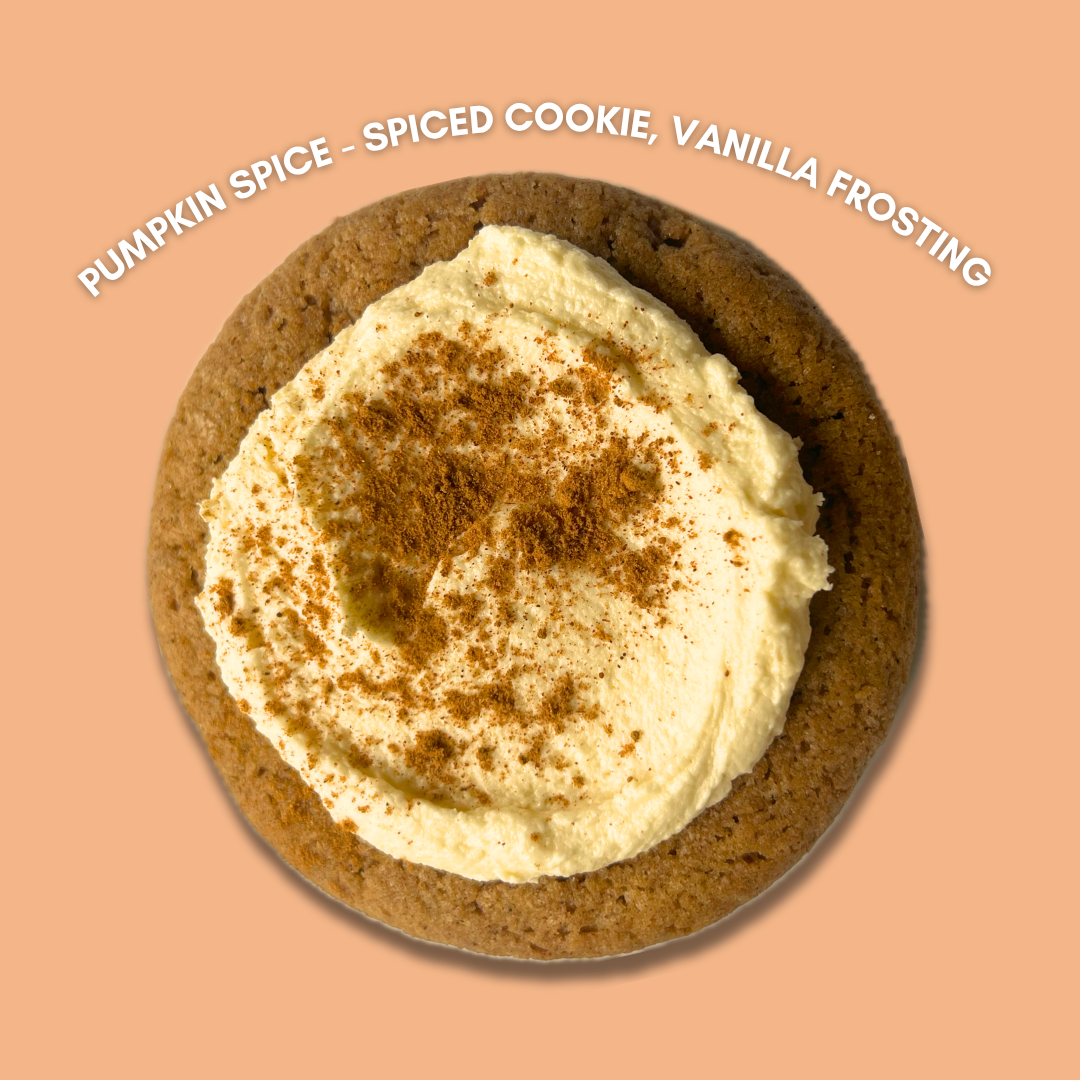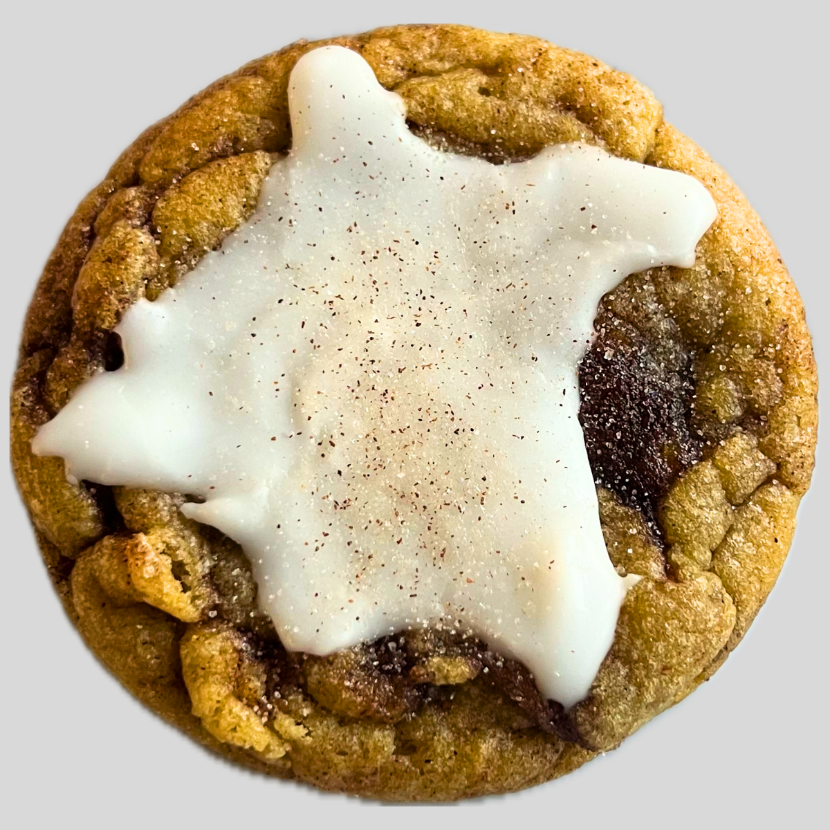 A vanilla cookie marbled with cinnamon sugar filling. Topped with an icing glaze and cinnamon sugar.