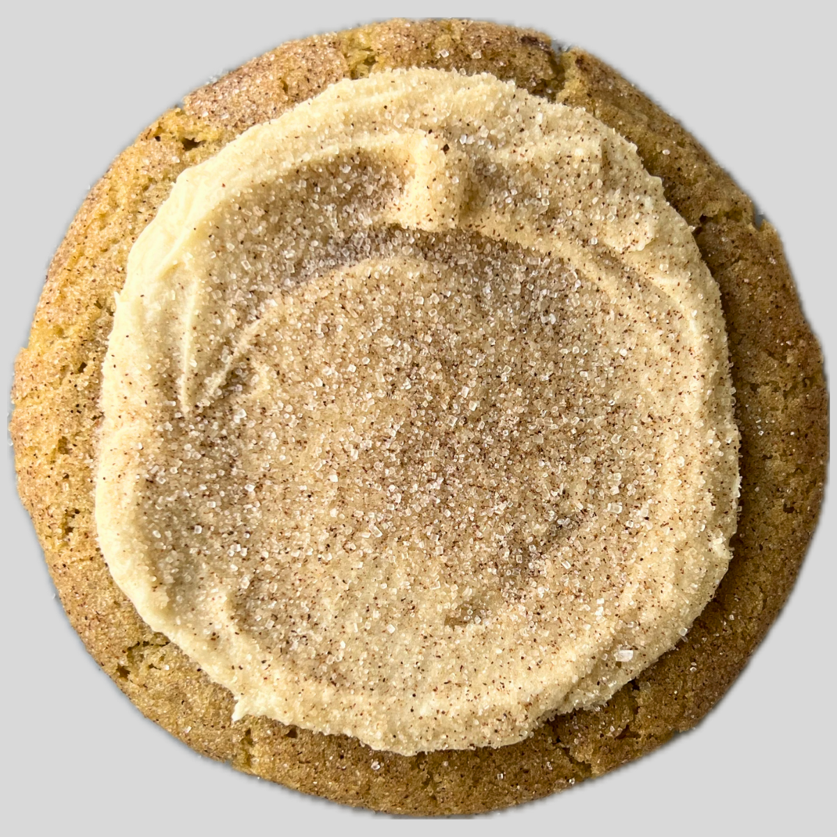 A snickerdoodle cookie topped with a vanilla frosting and an extra sprinkle of cinnamon sugar.