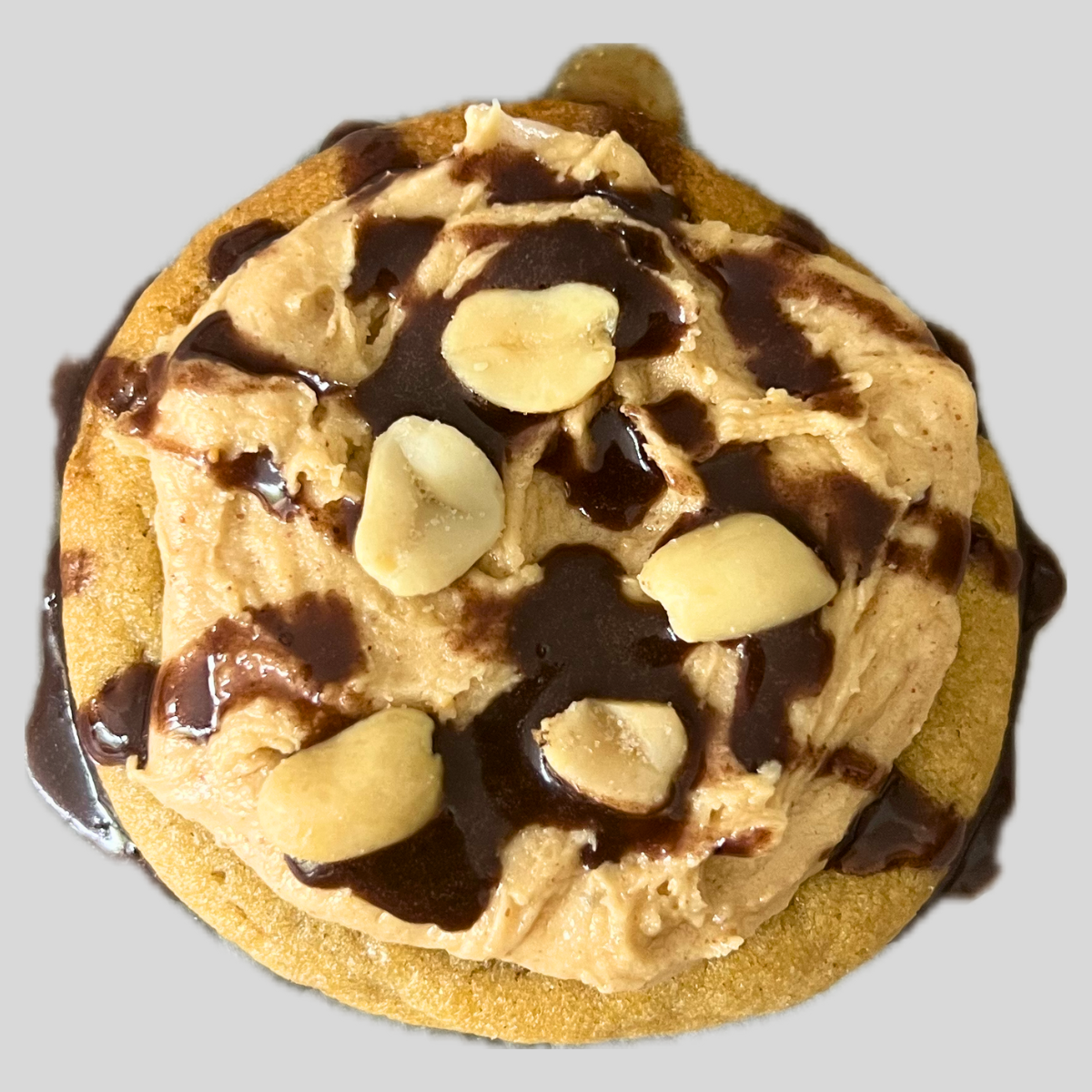 A toffee cookie topped with peanut butter frosting, salted peanuts and a rich chocolate glaze.
