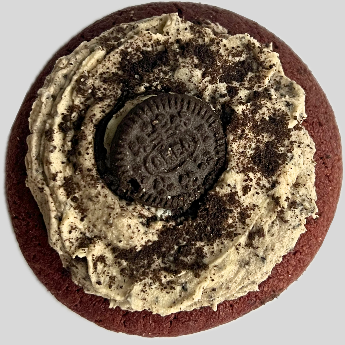 A red velvet cookie topped with creamy Oreo frosting and sprinkled with Oreo crumbs.